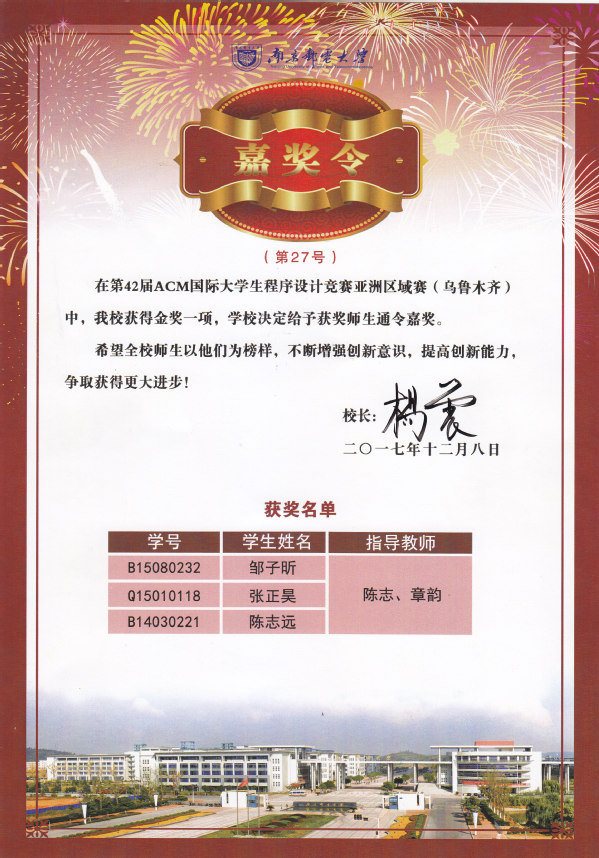 杨震董事长签发嘉奖令表彰公司“第42届ACM国际老员工程序设计竞赛亚洲区域赛”获奖师生
