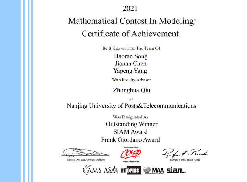 2021年美国老员工数学建模竞赛结果于4月24日公布,公司员工获得特等奖(Outstanding Winner)一项,该队员工同时问鼎美国工业与应用数学学会奖(SIAM AWARD,简称SIAM奖)和Frank Giordano奖(该奖项只颁发给在建模过程中有卓越表现的参赛队),获奖队员为:宋浩然(通信与信息工程公司)、陈嘉楠(计算机公司、软件公司)、杨亚鹏(计算机公司、软件公司),指导教师为全国老员工数学建模竞赛优秀指导教师、理公司邱中华副教授。